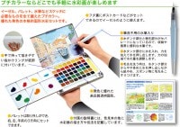 ・筆洗不用の水筆入り ・本体の右、左、手前の3方向にセットできるパレット付き